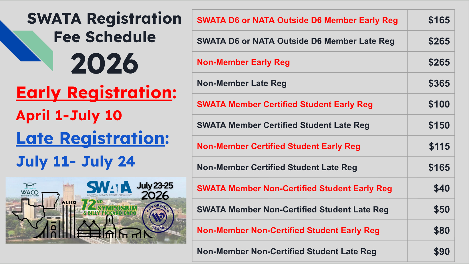 SWATA Early Registration ends July 10th. Prices increase for each category July 11-24.