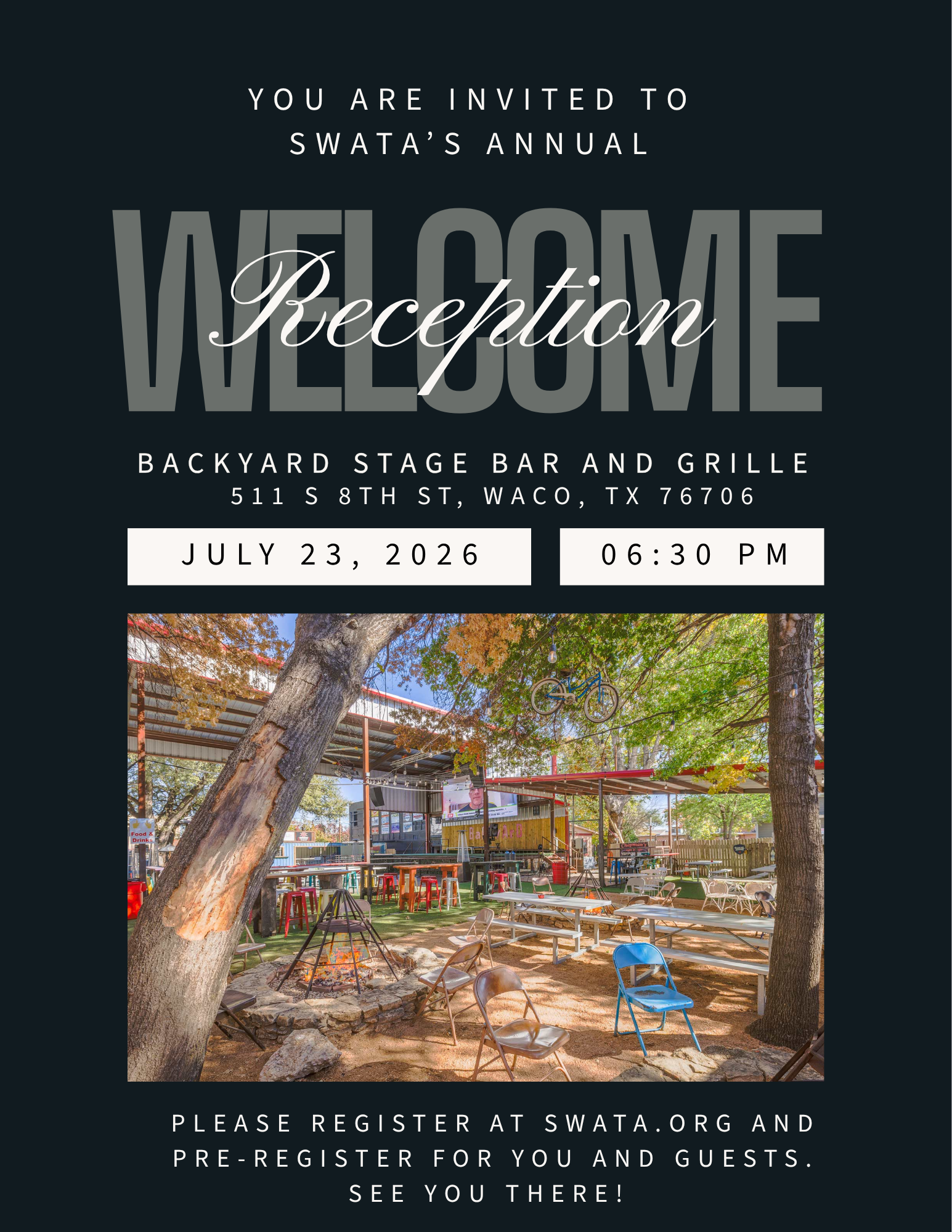 Registraton payment checks that do not arrive by July 15 will require you to pay by CC on-site prior to receiving a badge or accessing any sessions. We are unable to grant attendees access to SWATA Programming or CEU without payment upon arival in Waco. Please email Paul Dunham swataoperations@gmail.com if this situation applies to you before you arrive.